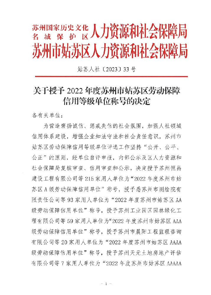 關(guān)于授予2022年度蘇州市姑蘇區(qū)勞動保障信用···